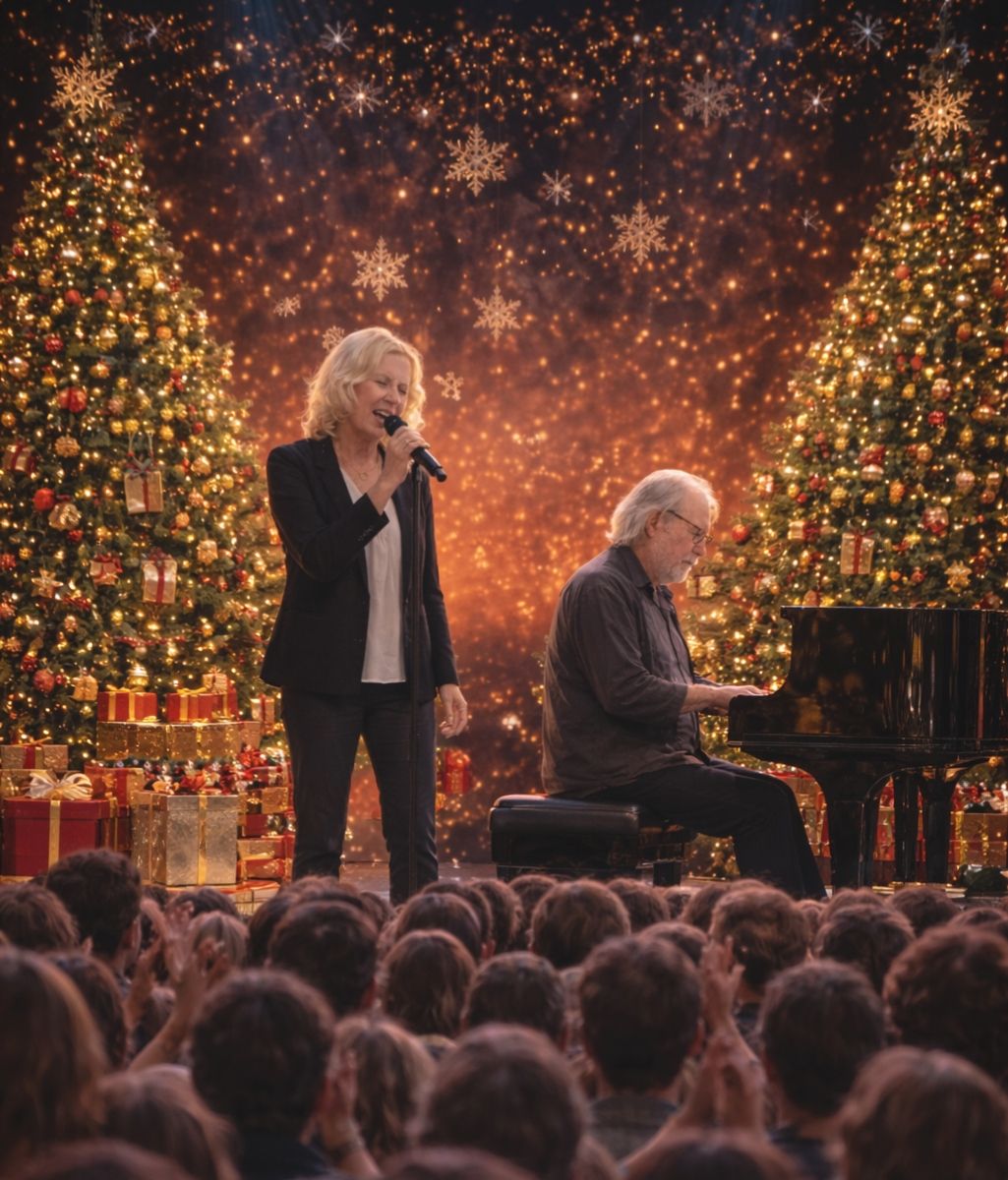 The lights softened until the room felt smaller, more human. Conversations faded. The audience leaned forward without realizing it. And then Agnetha Fältskog stepped into view, standing quietly beside the familiar piano of Benny Andersson.