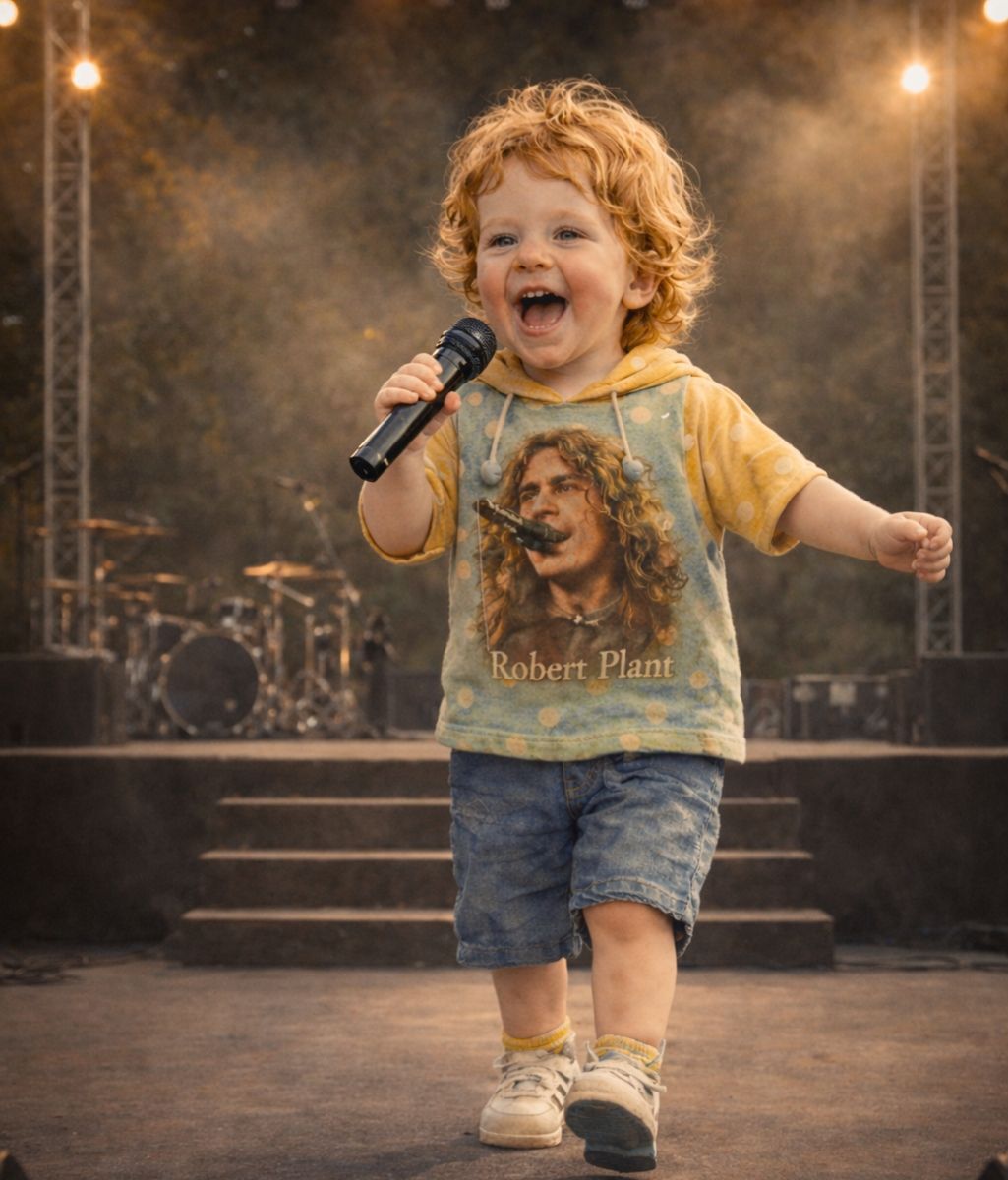 During a massive concert by Led Zeppelin in the United States—an outdoor night with more than 50,000 people gathered—noise gave way to stillness. From the side of the stage emerged a small figure, barely tall enough to hold a microphone. He was four years old. His name was Karac Pendragon Plant.