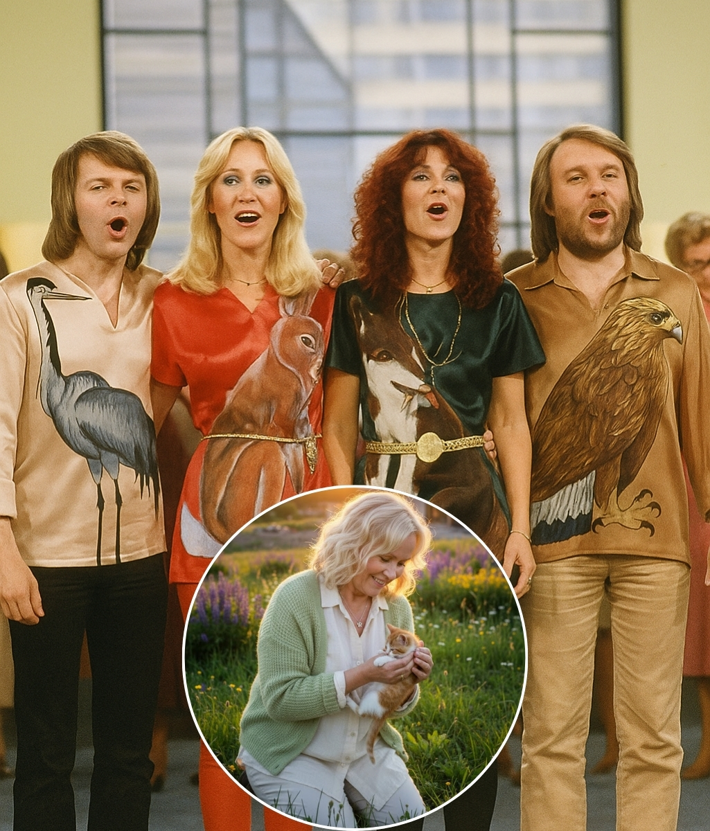 Two photographs capture that journey more powerfully than words ever could. The first — a familiar image from the golden years of ABBA, her face radiant under stage lights, the world at her feet. The second — taken decades later — shows her sitting in a quiet field, a gentle smile on her face as she holds a small kitten, bathed in the soft glow of sunset. No stage, no microphone. Only peace.