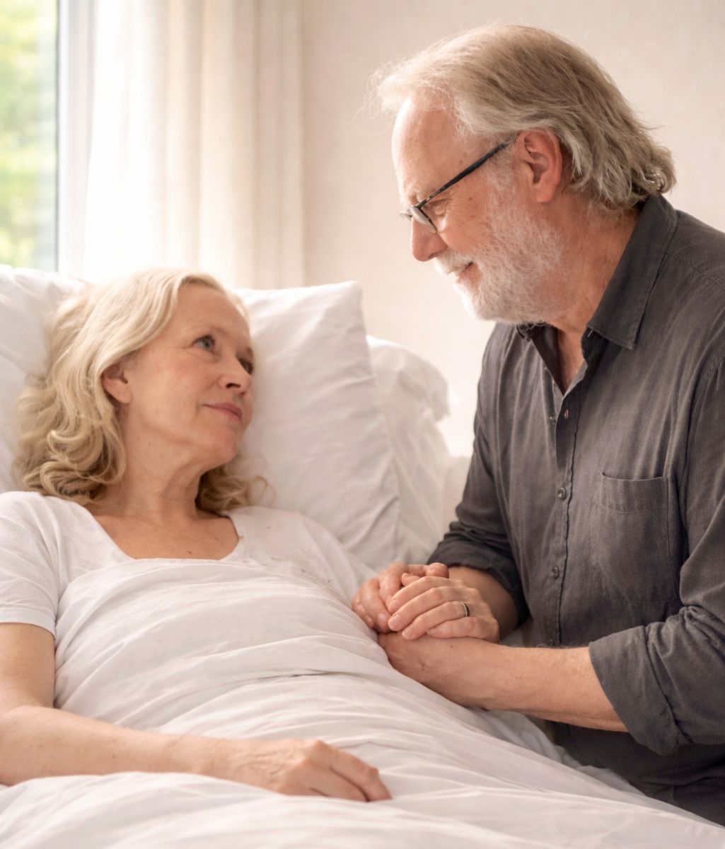 Inside a quiet hospital room, Agnetha rests. Her expression is calm but tired, aware but fragile. Time is present in her face, not as fear, but as truth. Standing beside her is Benny, glasses on, holding her hand — not for an audience, not for sympathy, but because that is where he belongs.