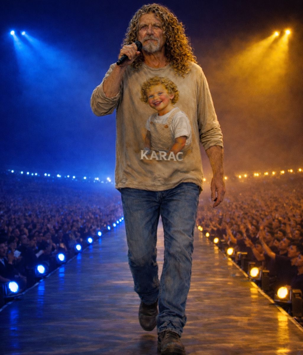 Midway through the concert, during a quiet and reflective interlude, the spotlight settled gently on Plant. The music softened. The room leaned in. In that moment, he revealed a simple shirt, unremarkable in design yet overwhelming in meaning. Printed upon it was the image and name of Karah Karac Pendragon Plant (1972–1977)—his young son, lost far too early. For three long seconds, the arena stood completely still. Breathing paused. Applause vanished. No one spoke.