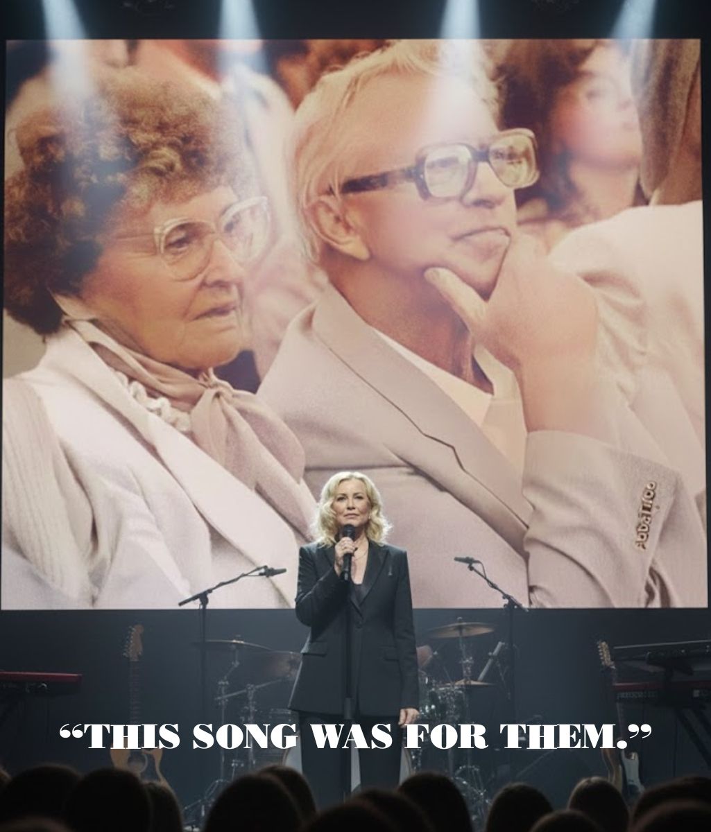 Tears appeared quietly — not dramatic, not announced. Just there. Even the stage lights seemed softer, as if they too understood the nature of what was unfolding. AGNETHA did not look at the screen behind her. She did not need to. She sang forward, but her heart was elsewhere — anchored in voices that once guided her, protected her, believed in her long before applause existed.