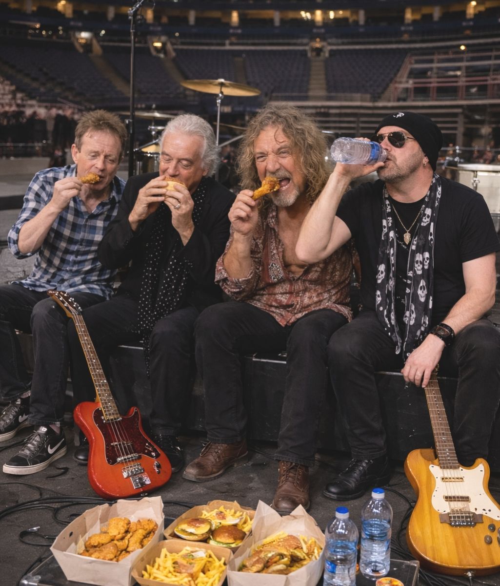 After hours on stage, the four shared a simple meal right at the rehearsal site. No press. No entourage. No ceremony. Just food, quiet conversation, and the unspoken understanding that the night ahead deserves more than routine preparation. Within a short time, instruments were back in hand. Guitars were tuned again. Drum placements were adjusted. Notes from earlier moments were revisited with fresh focus.