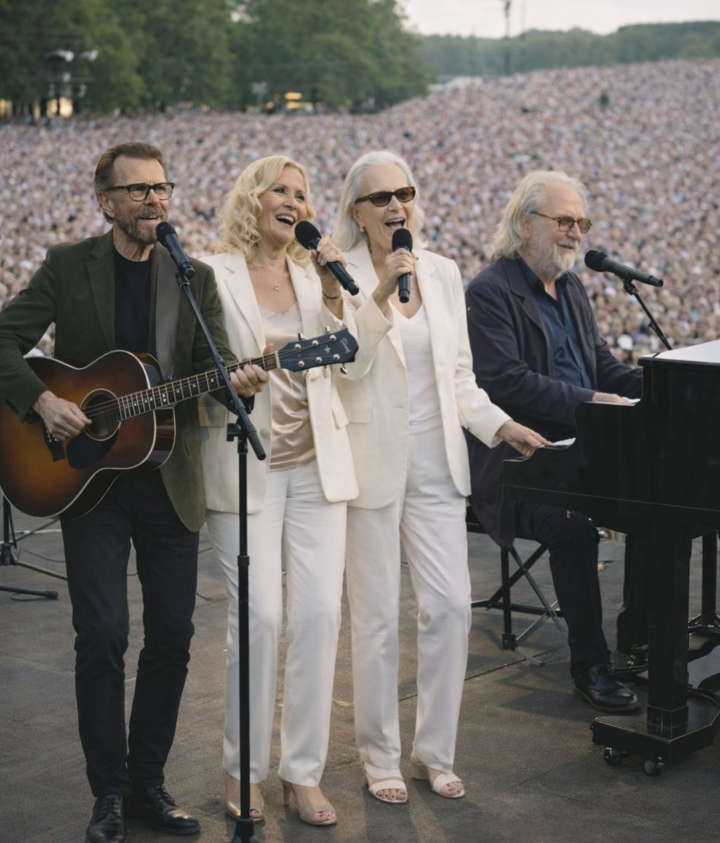 Inside a hushed arena, tens of thousands of people sat motionless, unsure whether to trust their own eyes. What they were witnessing felt impossible, yet unmistakably familiar. ABBA appeared to stand together once more, side by side, just as they had decades earlier.