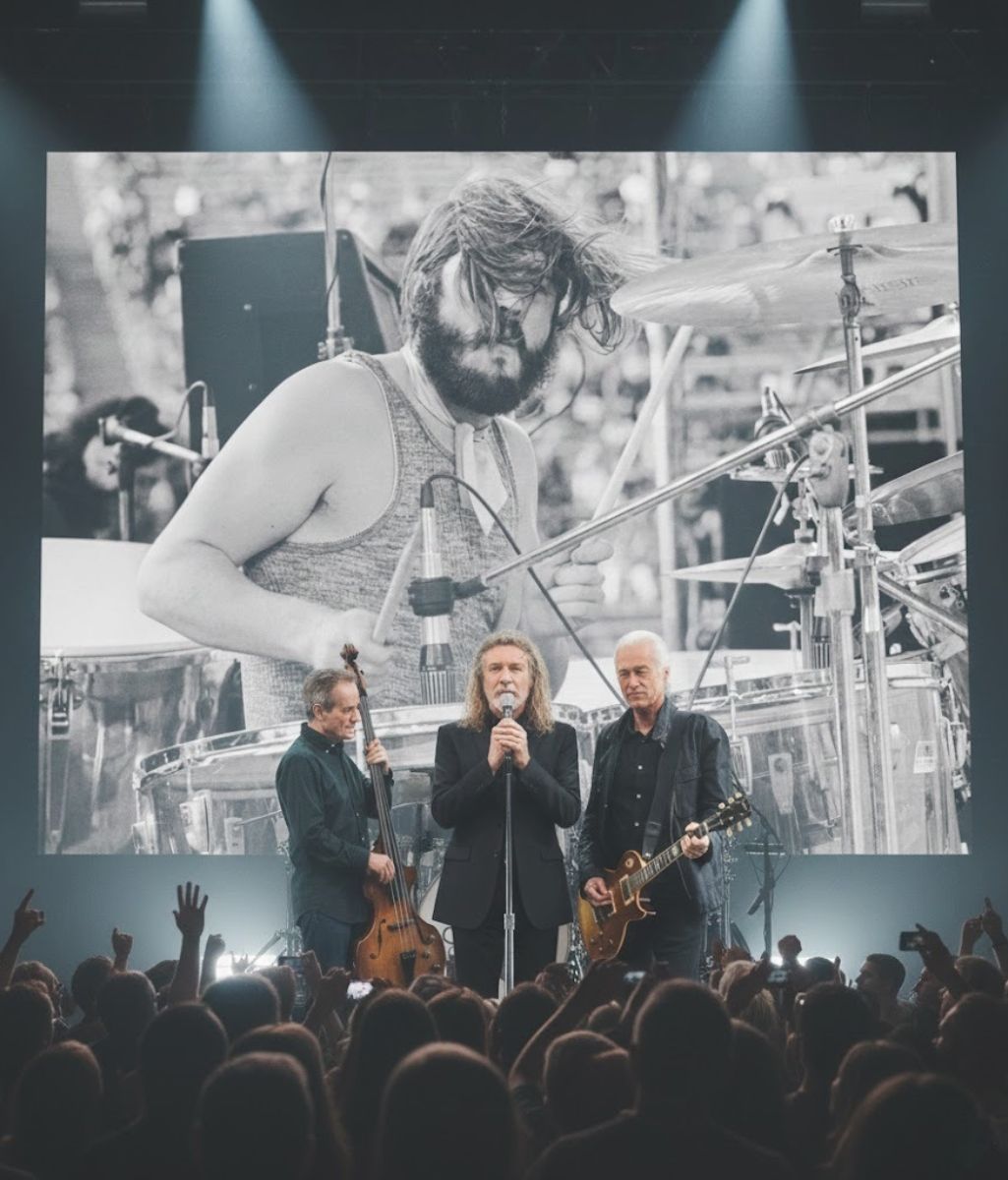 Behind him, the lights dimmed. The giant screen came alive with a single image. JOHN BONHAM — smiling, unguarded, frozen in a moment before the world changed. No montage. No effects. Just his face, looking exactly as those three men remembered him.