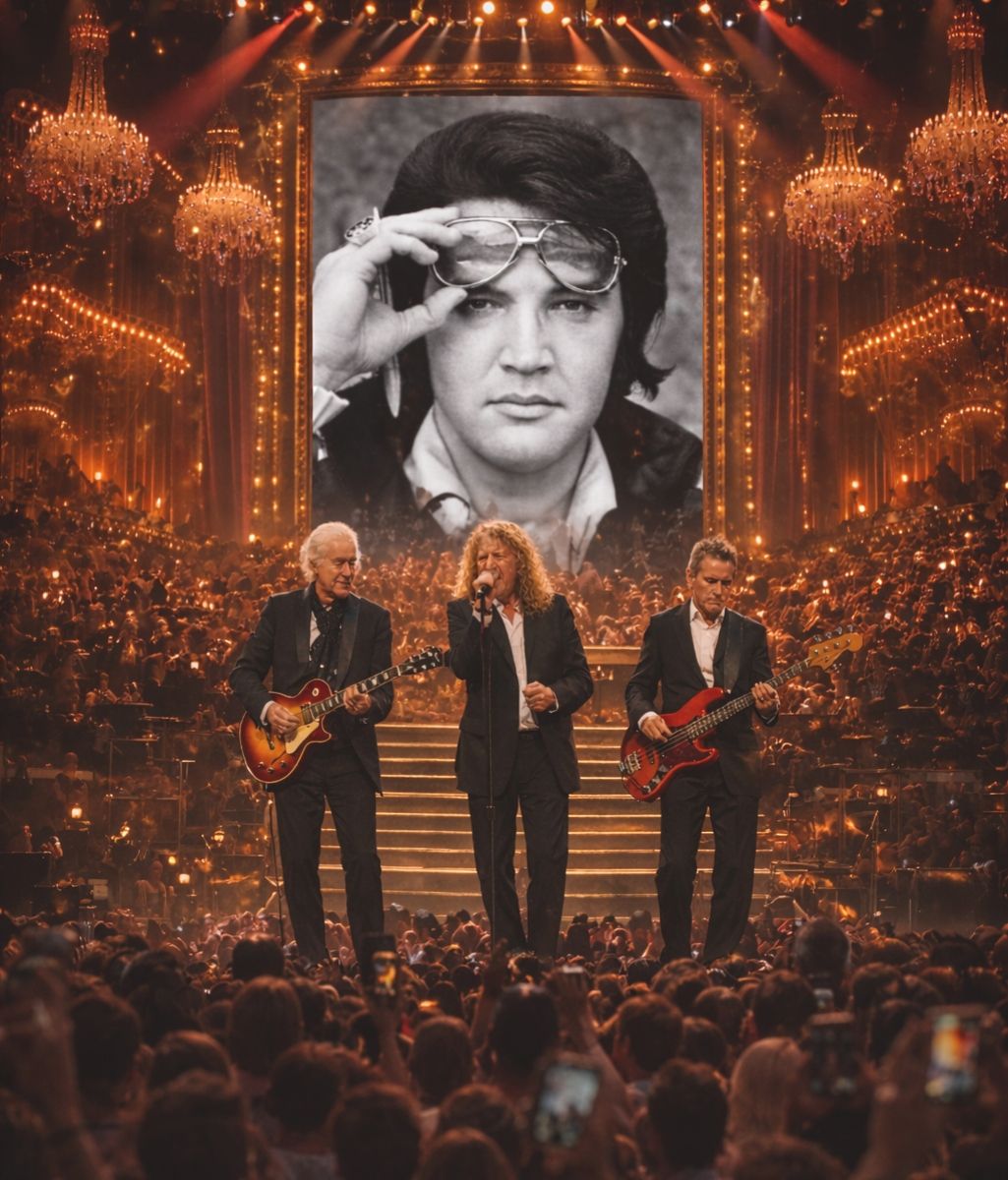 When Robert Plant began to sing, his voice did not reach for power. It reached for meaning. He chose a classic song from Elvis’s catalogue, delivered not as imitation but as reverence. Beside him, Jimmy Page’s guitar spoke softly, avoiding excess, while John Paul Jones anchored the moment with steady, grounded bass lines. Together, they created a sound that felt suspended between eras—modern in presence, timeless in spirit.