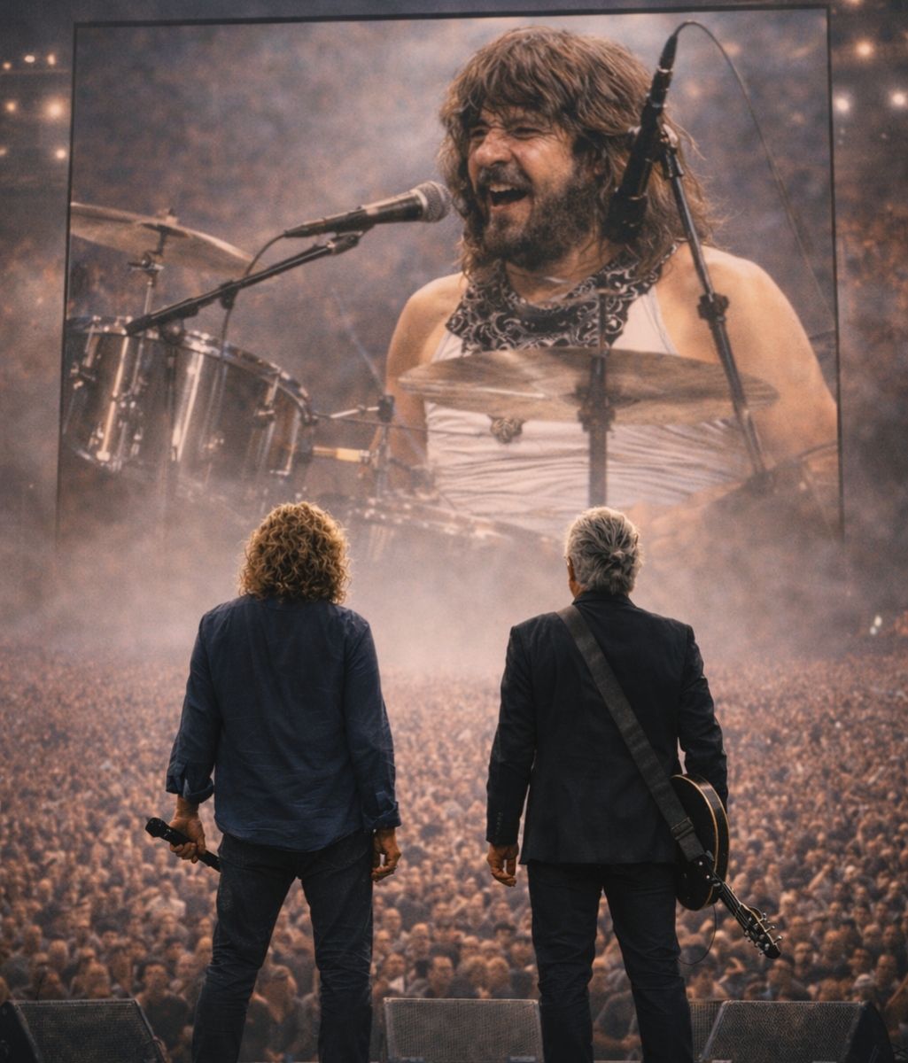 Those closest to the stage saw it first. Robert Plant’s posture changed. His hands trembled slightly. His expression was not theatrical — it was unguarded. Pride and pain existed together, inseparable even after decades. Beside him, Jimmy Page stood still, grounded, watching as if holding the present steady while the past surged forward without restraint.